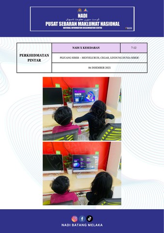5 Disember 2025 | Aktiviti TerkiniPada 04 Disember 2025 bersamaan hari Khamis, Webinar Pejuang Siber telah dijalankan. Tujuan utama program ini adalah untuk memberi kesedaran kepada peserta tentang kepentingan penggunaan Internet secara selamat, beretika dan bertanggungjawab serta membantu mereka memahami risiko ancaman siber dan langkah perlindungan yang boleh diamalkan dalam kehidupan seharian.